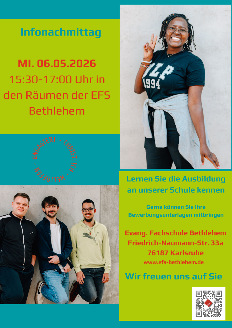 Herzliche Einladung zu unserem Infonachmittag am 06.05.2026 von 15.30 - 17 Uhr. Lernen Sie die Ausbildung an unserer Schule kennen. Wir freuen uns auf Sie!